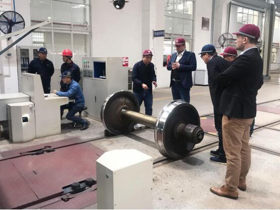 來(lái)訪客人參觀了此行程重點(diǎn)考察的我公司研發(fā)的安裝于鐵路單位用戶的大型檢測(cè)設(shè)備——激光輪對(duì)自動(dòng)檢測(cè)機(jī)